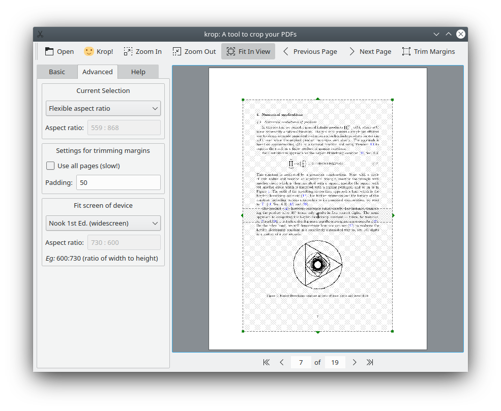 The Fit screen of device option allows us to split pages into subpages to fit the limited screensize of, say, a Nook eReader with a screen size of 730x600 (when held upside down). Note how the selection indicates that it will be split into two pages. Thus, the resulting cropped PDF file will have 38 instead of 19 pages, with each fitting the screen of the eReader perfectly; no zooming or scrolling required.