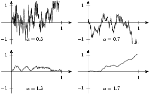 By the way, the graphs show trajectories of fractional Brownian motions with different fractions.